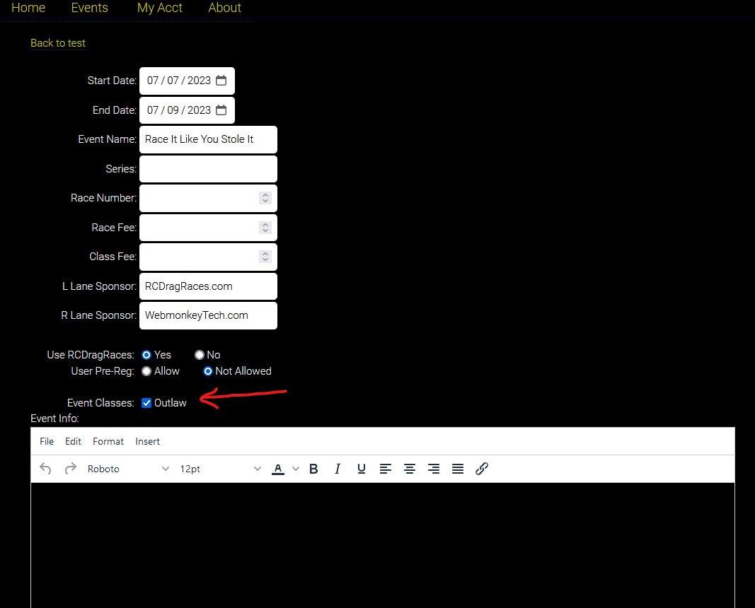 All Fields are optional except the Start Date, and Event Name. Race Fee is the same as Track Fee, then Class Fee is amount added per class.